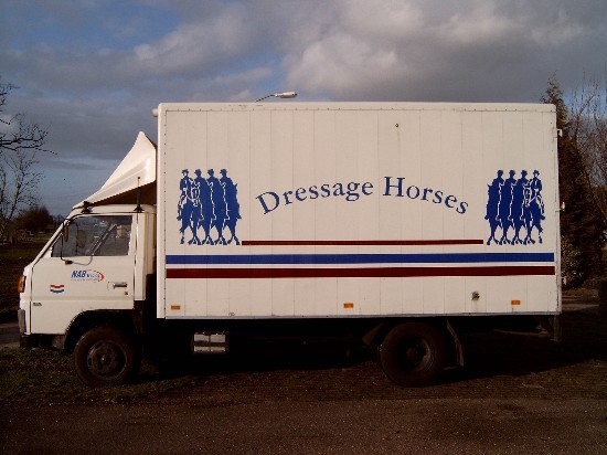 Mitsubishi paardenvrachtwagen ingericht voor 2 paarden, met tussenschot, zadelkast en zitbankje met opbergruimte, voorzien van rubberen antislip-gietvloer, ruimte voor 3 personen in cabine.
